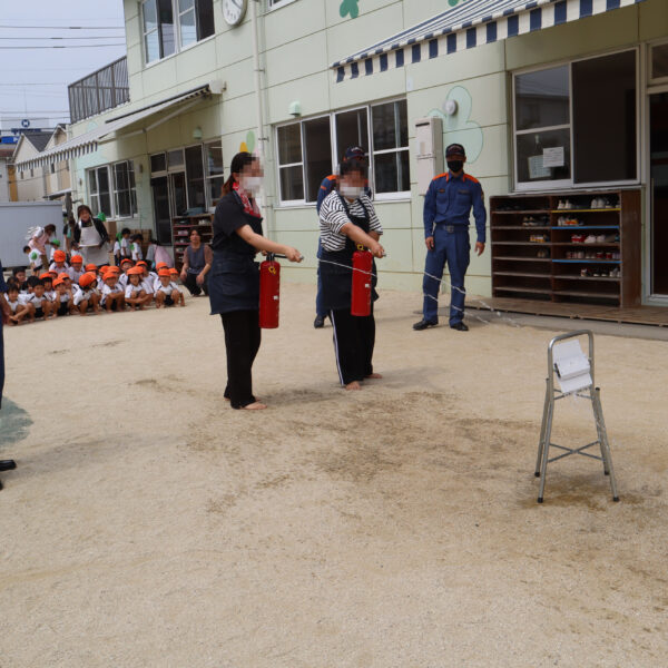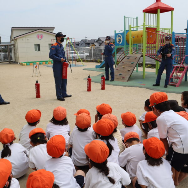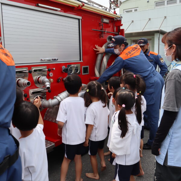避難訓練・消火訓練では消防士の方にも来て頂き、火事や避難についての約束を教えてもらいました。職員の消火訓練も行いました。消防車を近くで見た子どもたちからは消防士さんへの質問がたくさん飛び交いました。